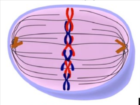 Микротрубки веретена крепятся к кинетохору (белковой конструкции на хромосоме) каждой хромосомы. Затем они как бы выравнивают их расположение по центру. Это значит, что хромосомы расположены на одинаковом расстоянии от полюсов клетки.